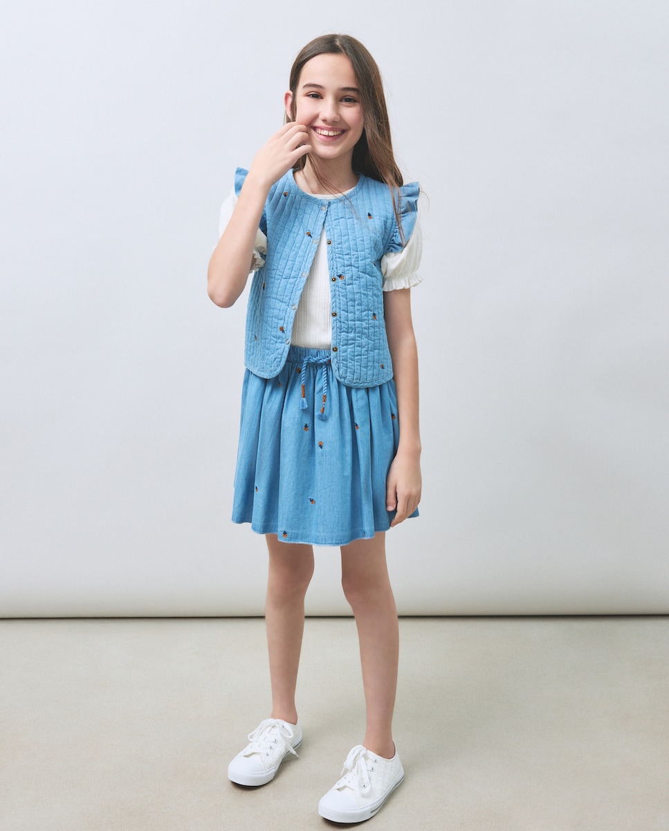 Saia Rodada de Chambray com Estampado Bordado