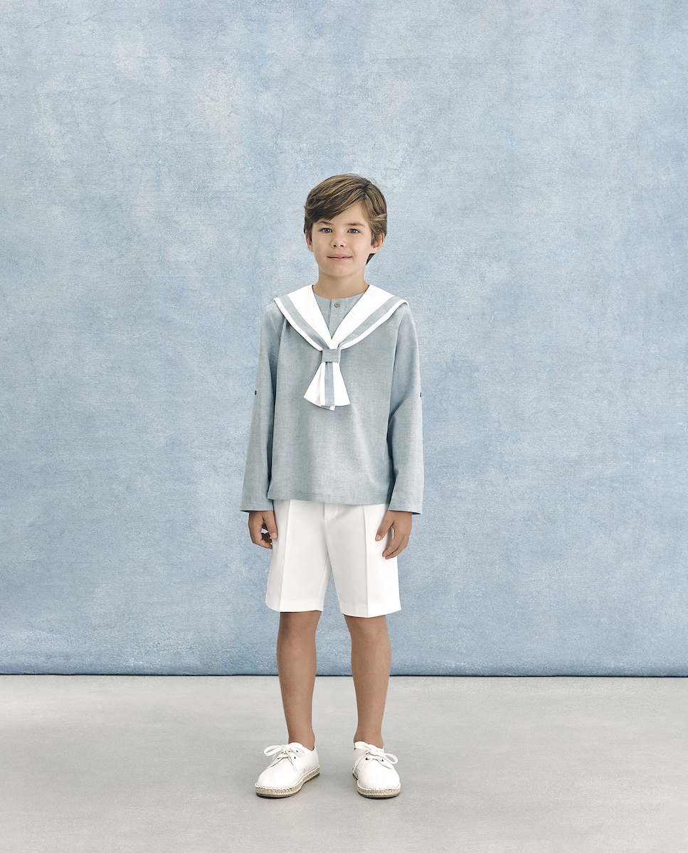Fato marinheiro FÉNIX da Oxford com camisa e babete removível, acompanhado de calções brancos de malha.