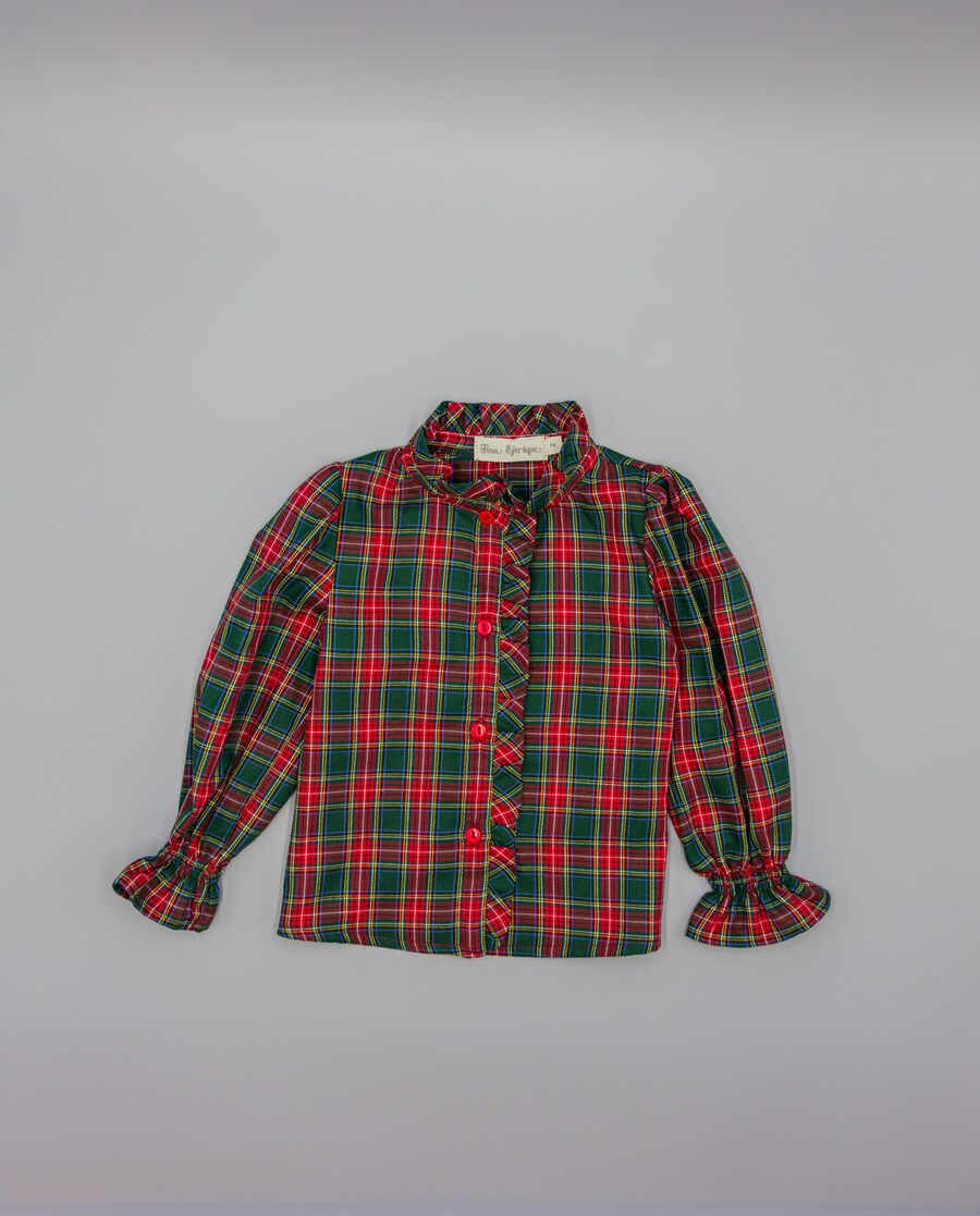 Camisa aos quadrados verdes e vermelhos para menina, confecionada em algodão 100%. Possui folho na gola e na parte frontal. Abrevia no centro com botões que simulam porcelana. Os punhos possuem borracha que forma um pequeno folho. Disponível desde o tamanho 2 até o 16.