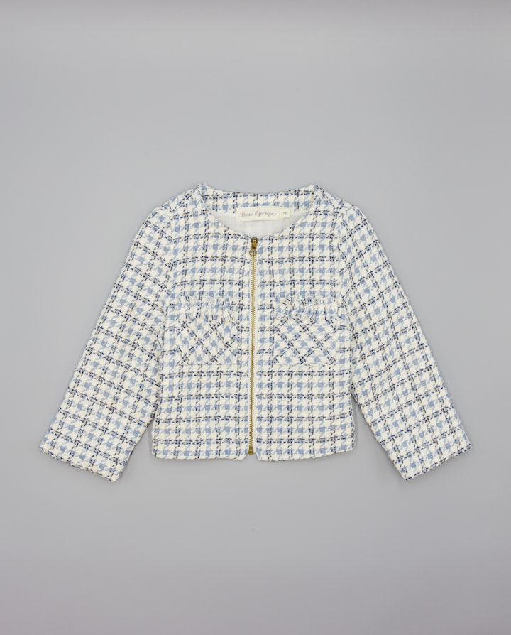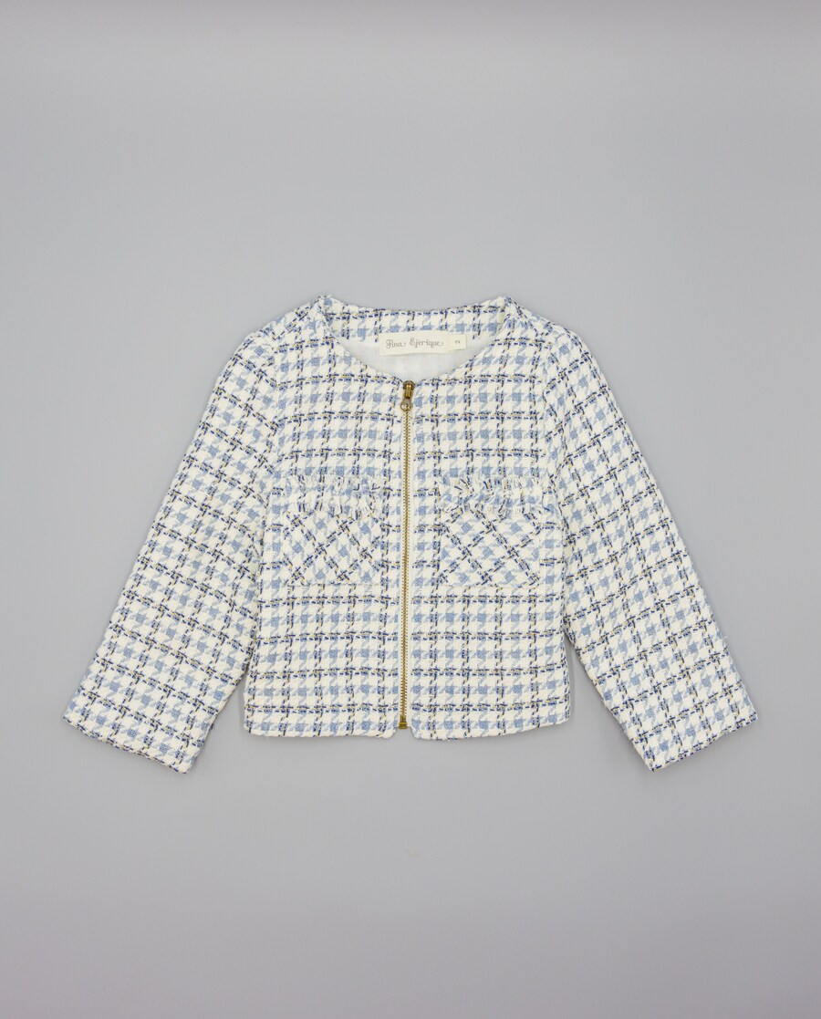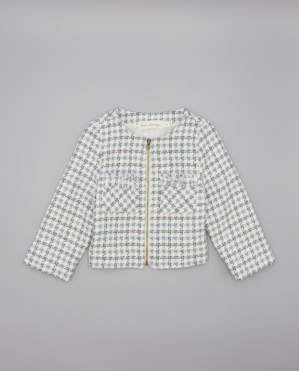 Casaco azul de tecido estruturado com quadrados. Design com corte a direito, sem cortes, com bolsos altos tipo plastrão adornados com um volante desfiado. Fecha com fecho de correr frontal. Totalmente forrado em algodão 100%. Disponível em tamanhos de 2 a 16 anos.