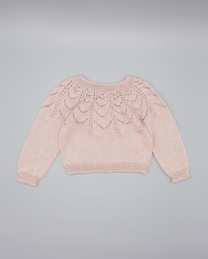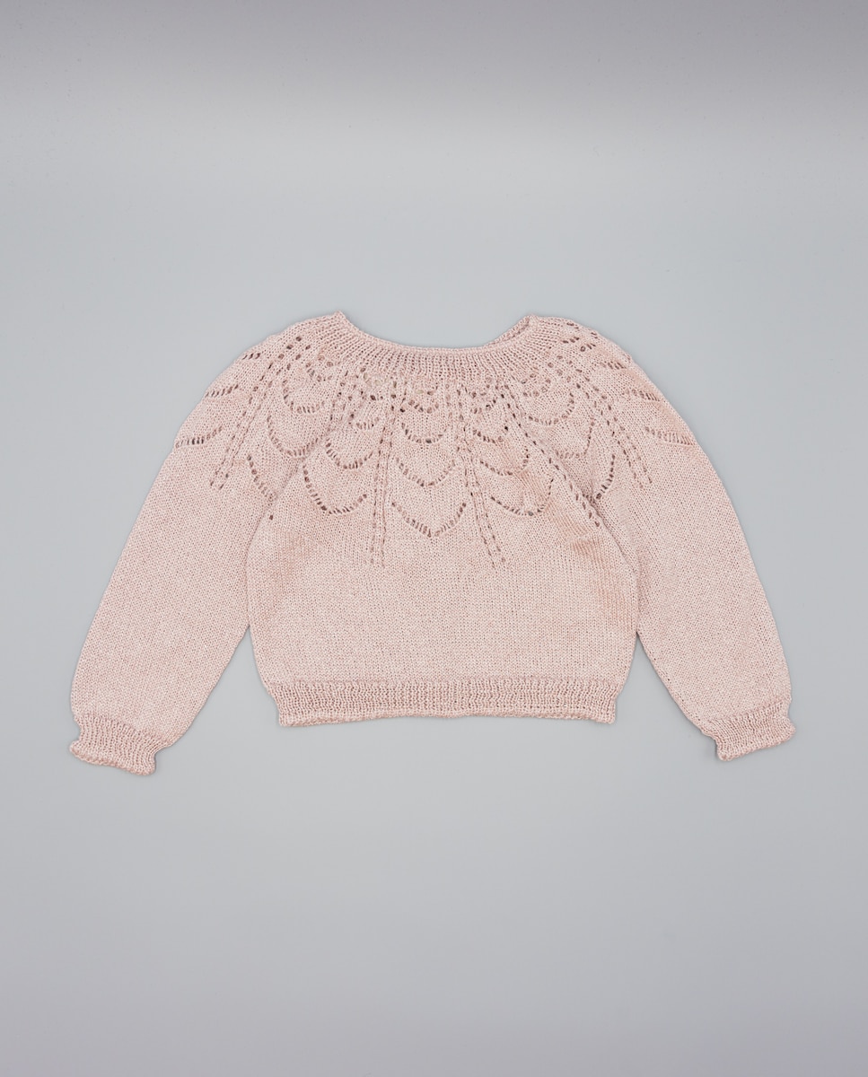 Casaco rosa de tricot com fio brilhante, fecho frontal com botões de madrepérola e calados decorativos em forma de folhas. Ideal para dar um toque elegante e luminoso a qualquer look. Disponível em tamanhos de 2 a 16 anos.