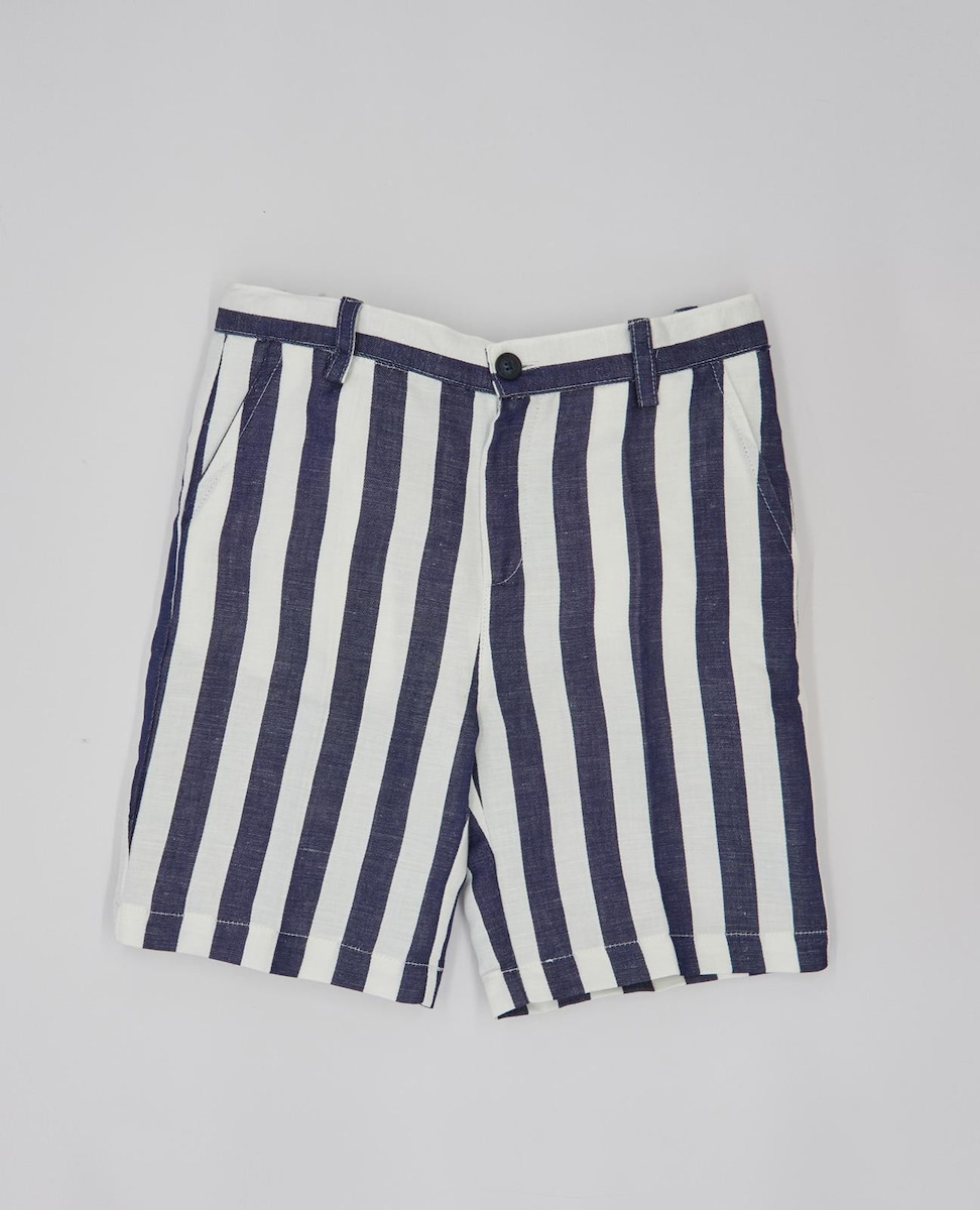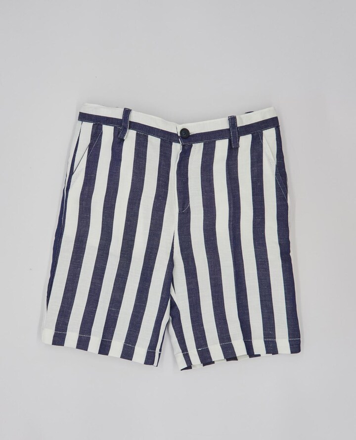 Bermudas de linho às riscas azul-marinho. Com bolsos falsos e botões na parte posterior e braguilha.