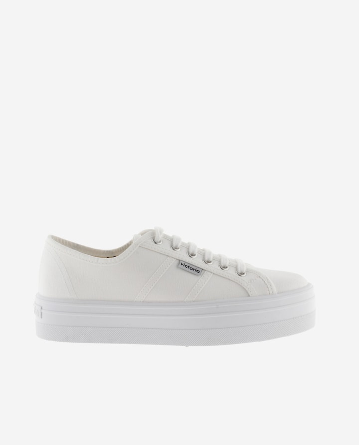Sapatilhas com plataforma para mulher e menina. Fabricadas em Espanha em lona de algodão ecológico. Etiqueta de vitória cosida na lateral. Fecho mediante atacadores ao tom. Confortável sola branca de PVC de 4 cm elaborada com óleos vegetais em vez de minerais, reduzindo assim o impacto ambiental.