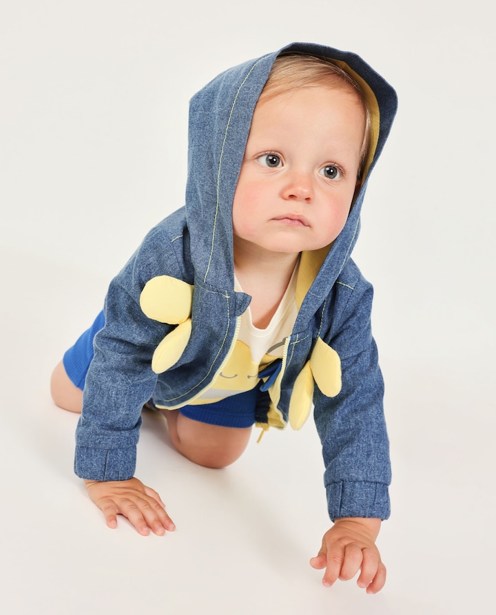 Casaco de ganga para menino, confecionado em um tecido denim suave e confortável. Apresenta capuz com um divertido design bordado na parte posterior, que inclui bochechas rosadas e anteninhas, aportando um toque infantil encantador. Na parte frontal, incorpora detalhes acolchoados em amarelo que simulam asinhas, criando um efeito lúdico e original. O fecho de correr permite vestir e despir o pequeno com facilidade. Uma peça prática e cheia de personalidade para o dia a dia.