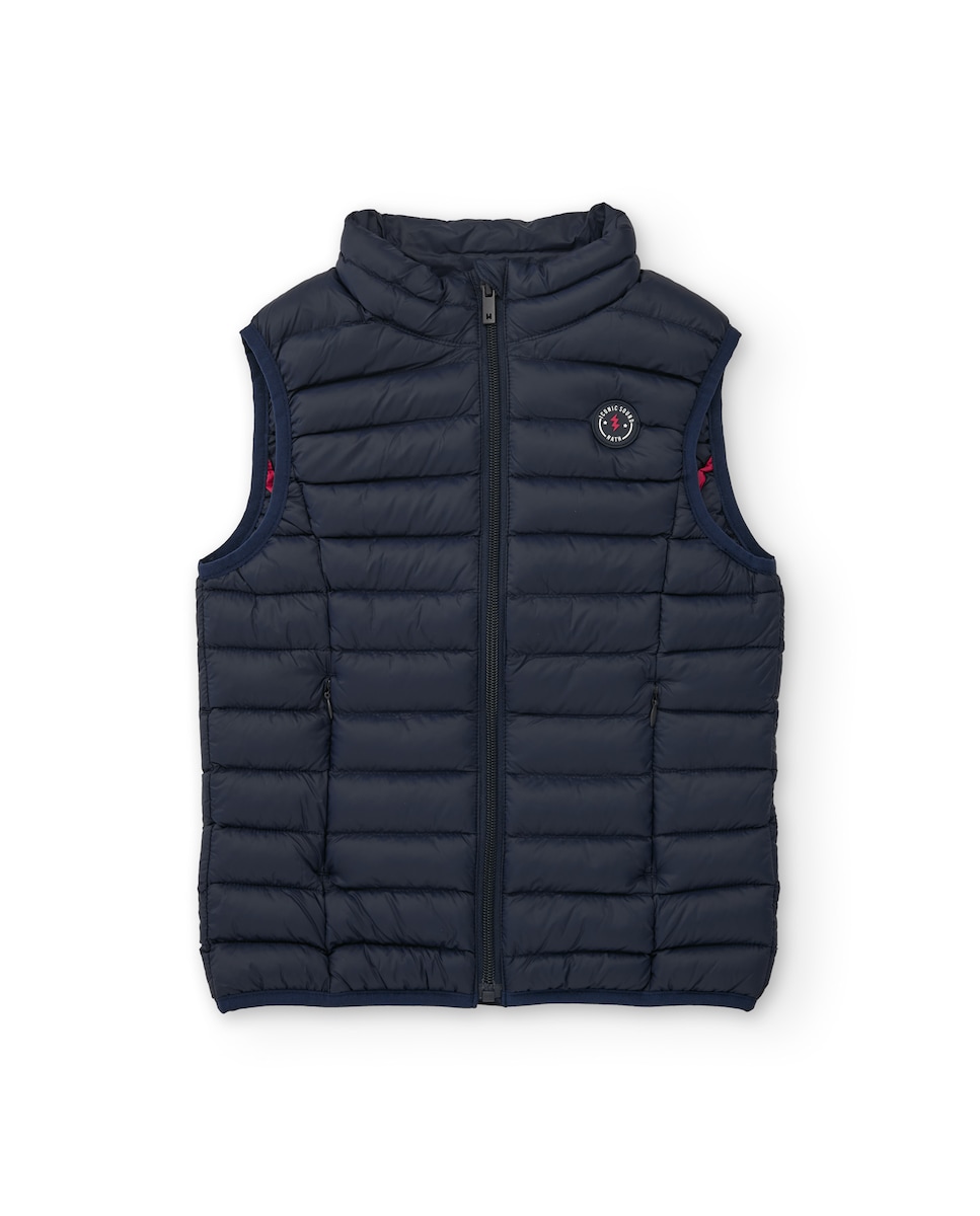 Colete acolchoado de menino em azul-marinho, desenhado para oferecer calor sem limitar a mobilidade. Apresenta um fecho de correr frontal em tom, gola alta para maior proteção e dois práticos bolsos laterais. Um básico versátil e leve, perfeito para combinar com T-shirts, camisas ou sweatshirts nos dias mais frescos.