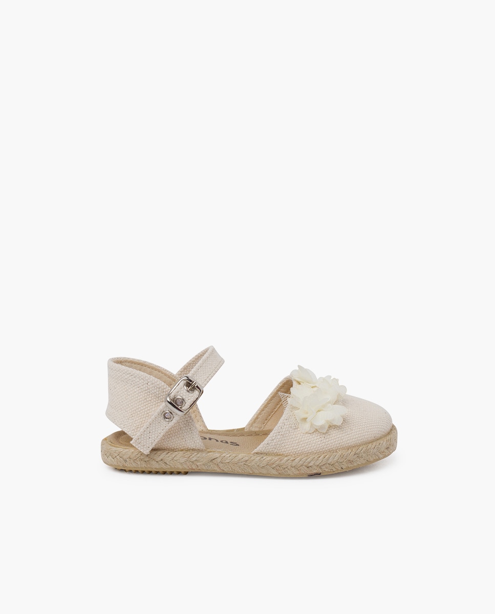 Novas alpercatas de cerimónia para completar os modelos mais elegantes nas tuas ocasiões mais especiais de primavera e verão. Estão fabricadas de forma artesanal em linho fresco, com um atemporal design de fecho de fivela e calcanhar descoberto. Contam com uma prática palmilha têxtil para que a pisada seja muito confortável e o pé transpire em todo momento quando mais calor faz. Além disso, a sola é de borracha antiderrapante e leva à volta uma veranil faixa de juta, característica habitual das alpercatas tradicionais. Se estás à procura de calçado de cerimónia para a tua pequena, com estas alpercatas oferecem-te conforto e frescura em partes iguais e o toque distinto do seu detalhe de flores de organza.