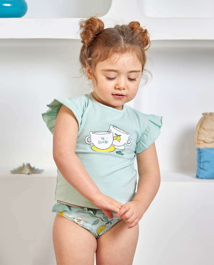 Cueca de bebé menina estampada com canecas e limões. Folho em contraste e laço por trás.