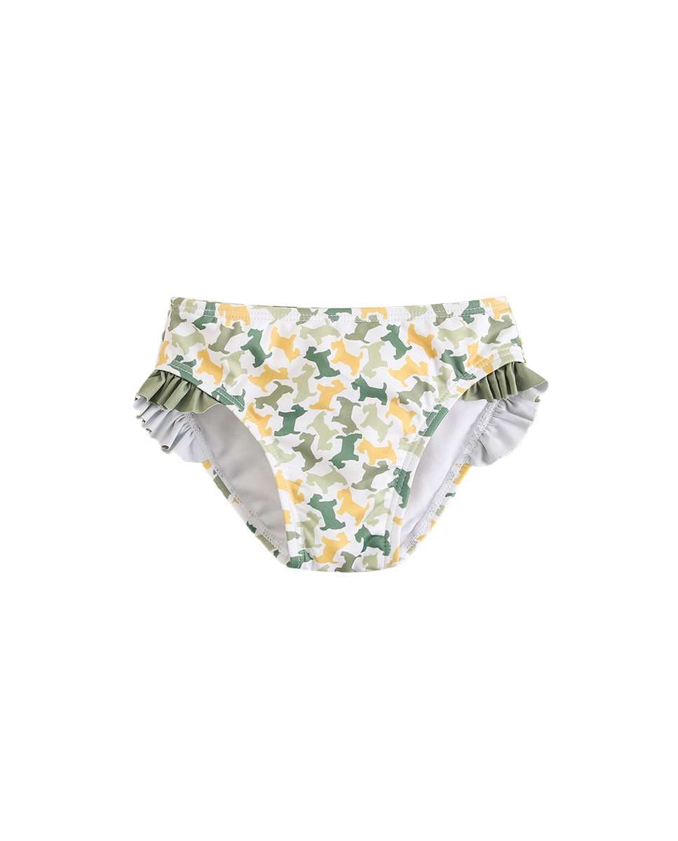 Cueca para bebé menina com estampado de camuflagem em mostarda e verdes. Detalhe de patch "Pegada" por trás. Folhos nas pernas.