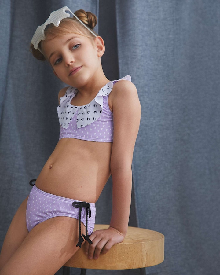 Biquíni de menina malva estampado com bolinhas brancas, parte de cima com folho branco estampado estrelas pretas e braguita com adornos de estrelas.