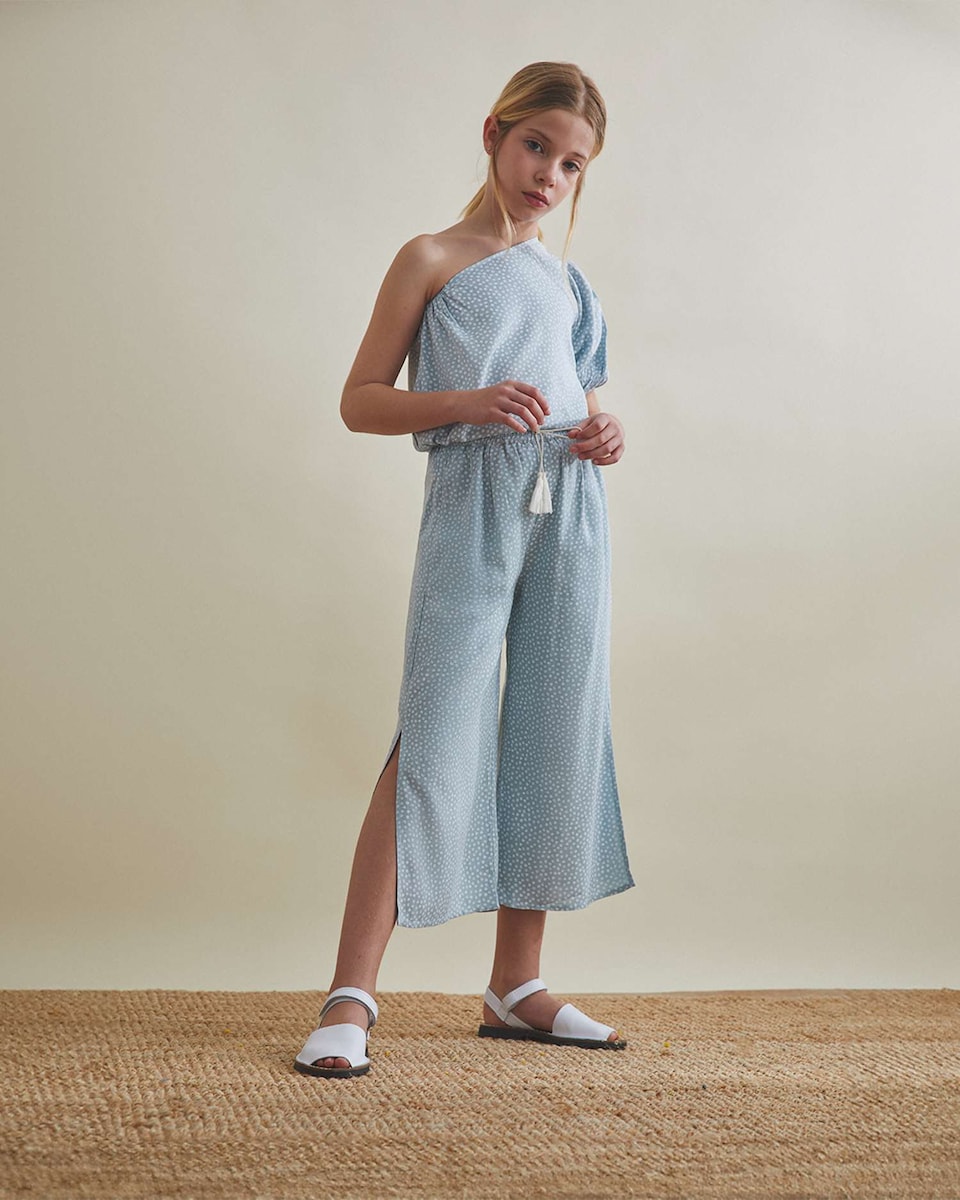 Top de rapariga de uma manga em turquesa e com bolinhas brancas com nó na lateral da cintura.