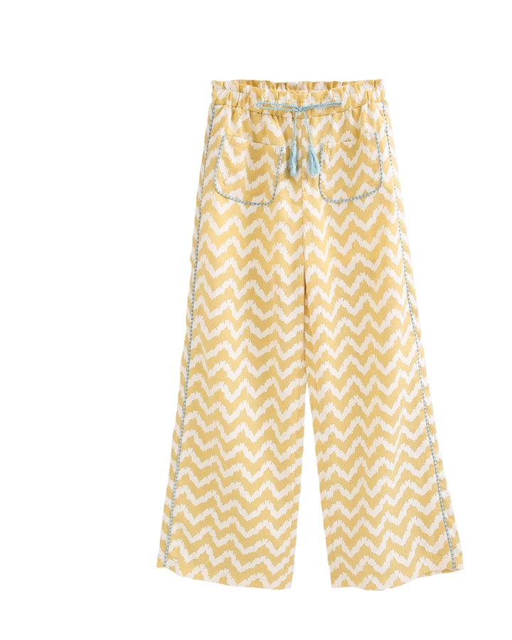 Calças de menina às riscas zigzag mostarda e branco com cós elástico e cordões e bolsos com detalhes turquesa.