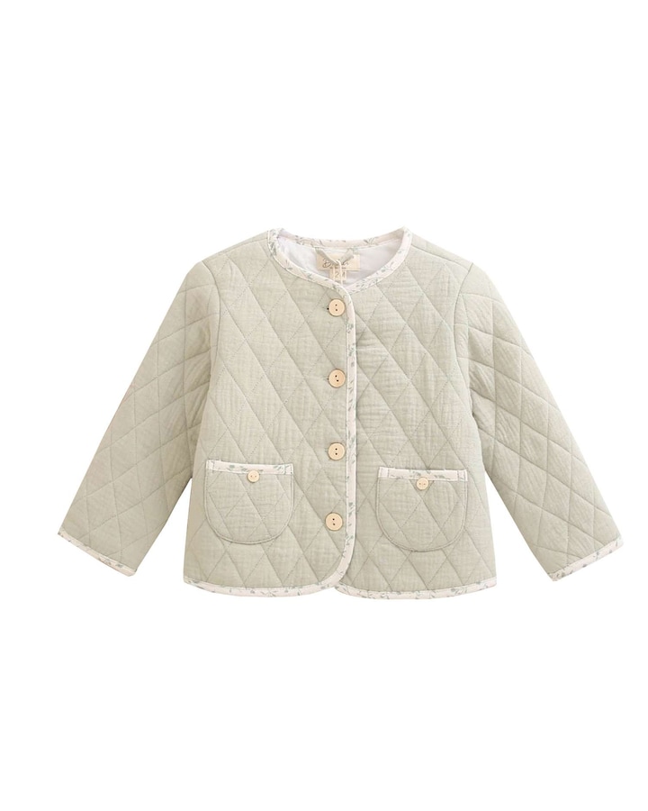 Casaco acolchoado de bebé menina com bainhas e estampado de folhas, bolsos e botões de madeira frontais, quente, confortável e encantador.