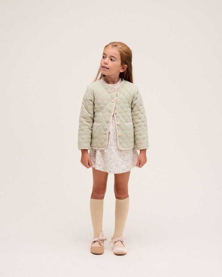 Casaco acolchoado para menina com bainha e estampado de folhas, bolsos e botões de madeira frontais, quente, confortável e encantador.