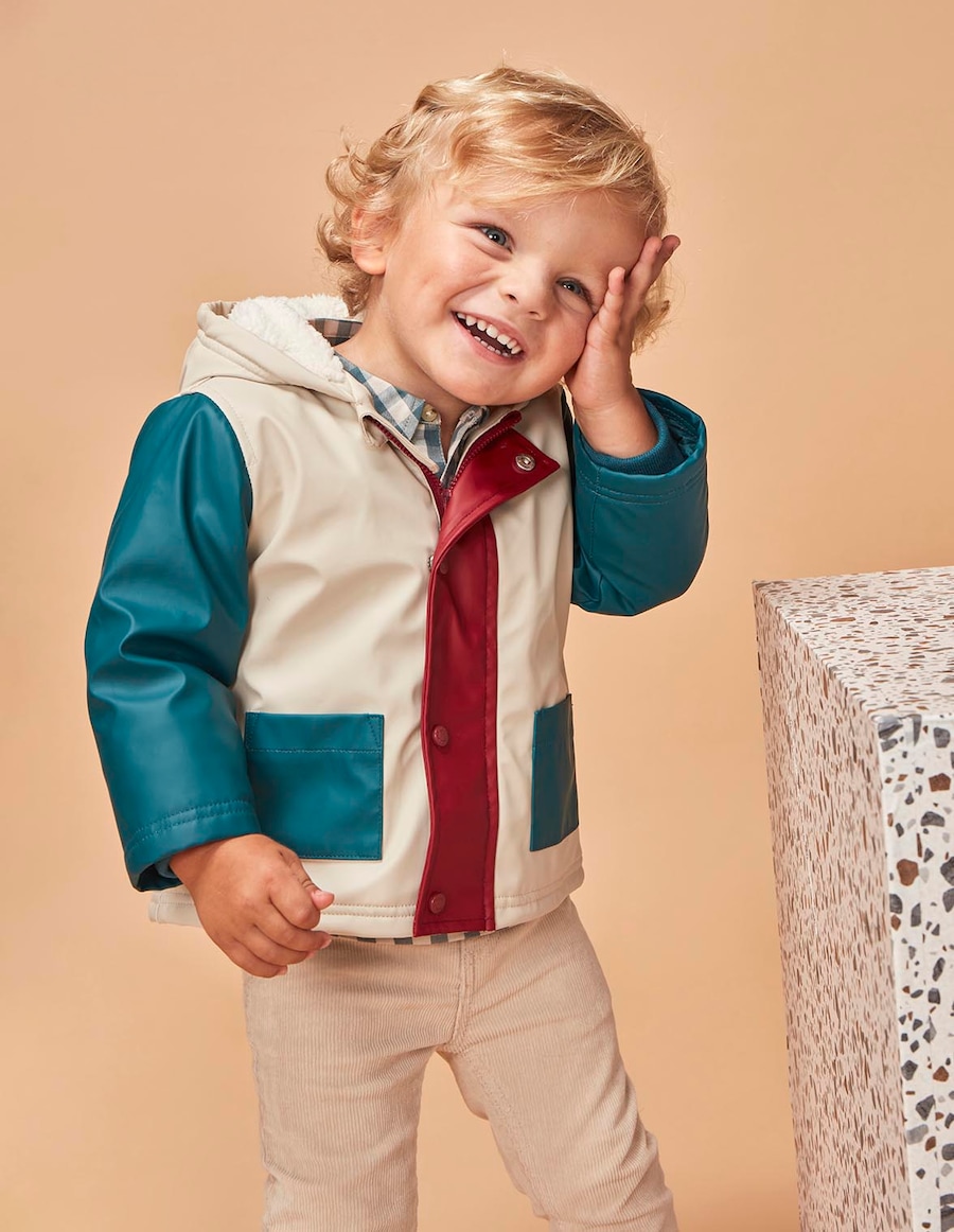 Impermeável tricolor, mangas e bolsos em petróleo, aba em bordeaux e corpo em pedra. combina blocos de cor para um look atual e urbano.