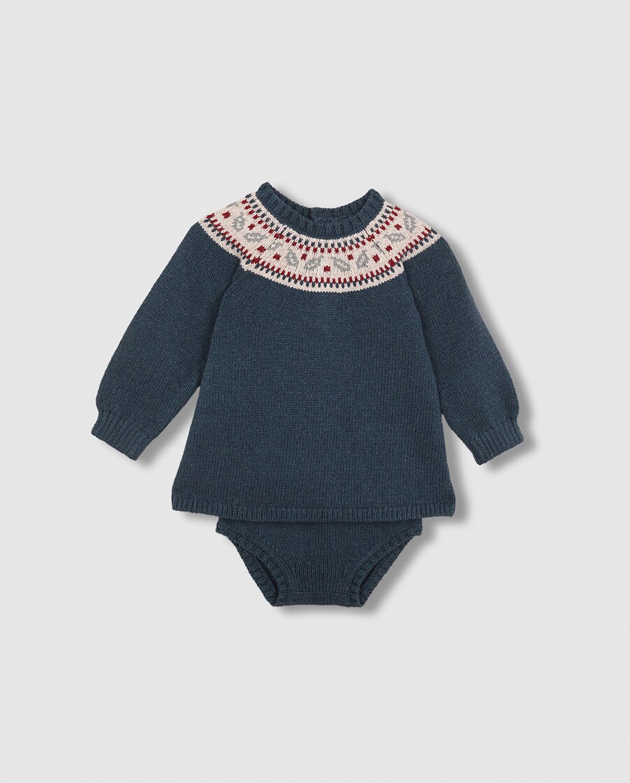 Vestido com grelha de inspiração natalícia na gola e manga abalonada. trata-se de um jersey perfeito para os jantares de Natal.