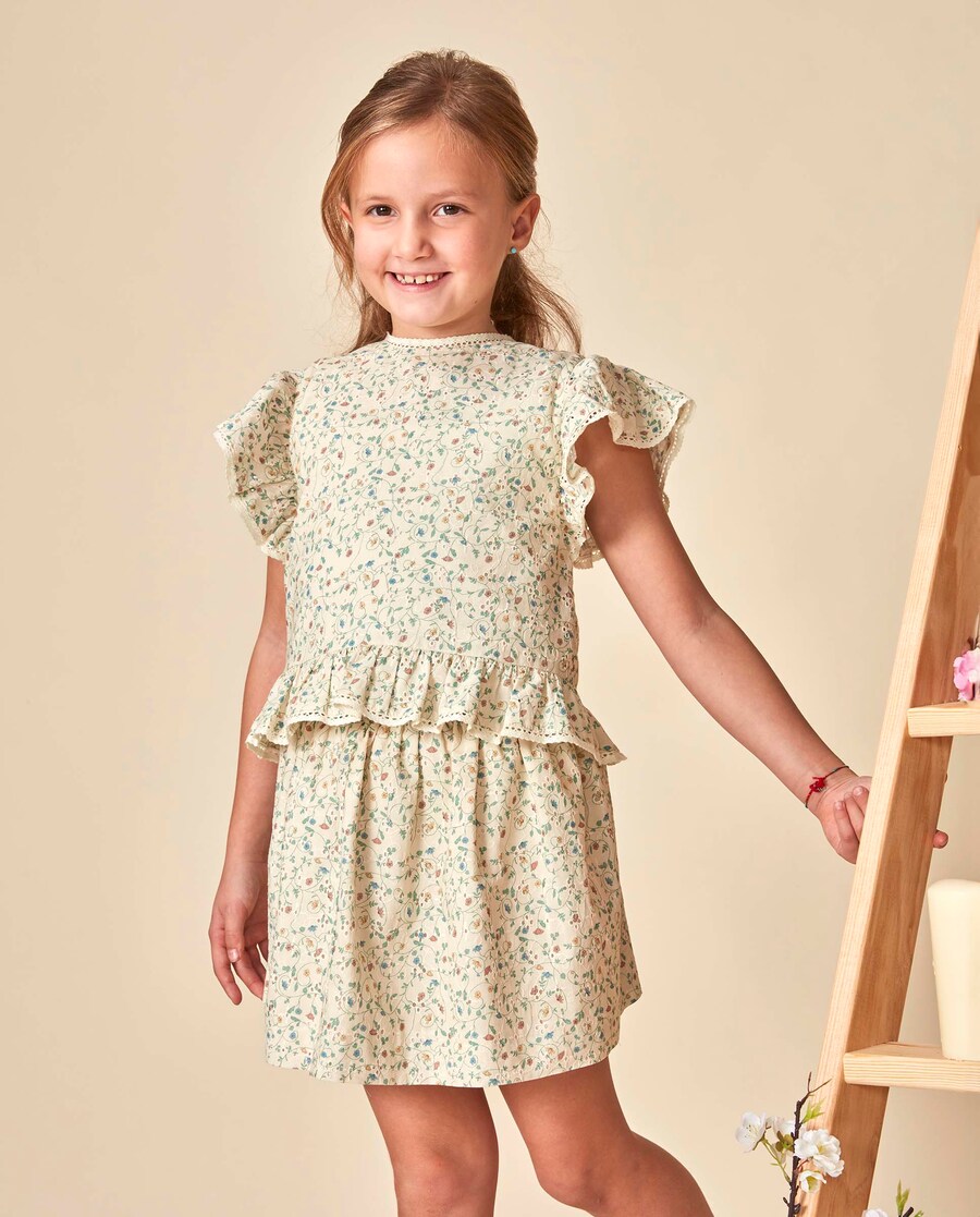 Saia curta estampada sobre um tecido de openwork com bordados, fecho de correr invisível num dos lados.