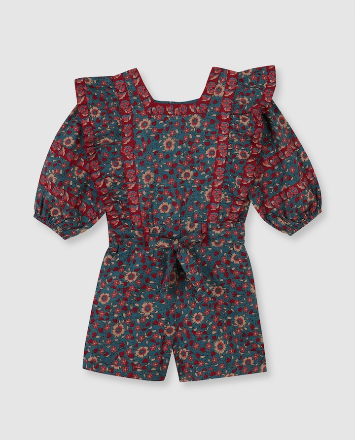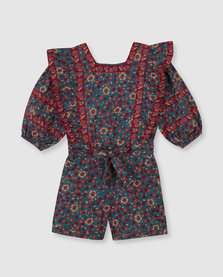 Macacão estampado com numerosas tiras presentes nos volantes, na gola e nas mangas.