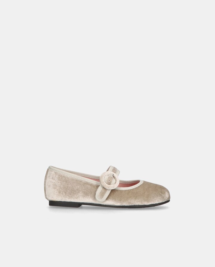 Sabrinas planas modelo Hannah em veludo azul marfim e pulseira sobre o peito do pé, sola de borracha, palmilha de pele e forro de tecido.