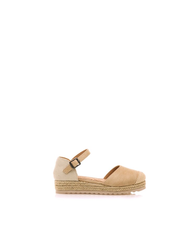 Sandálias de menina da marca Mtng, modelo Pad. Estas sandálias contam com uma biqueira fechada adornada com um detalhe tecido, ideal para um look versátil. A plataforma forrada em juta agrega um toque natural, enquanto o fecho ajustável com fivela no tornozelo assegura um ajuste perfeito. Ideais para o verão, combinam estilo e funcionalidade para completar os seus outfits com um ar fresco e moderno.