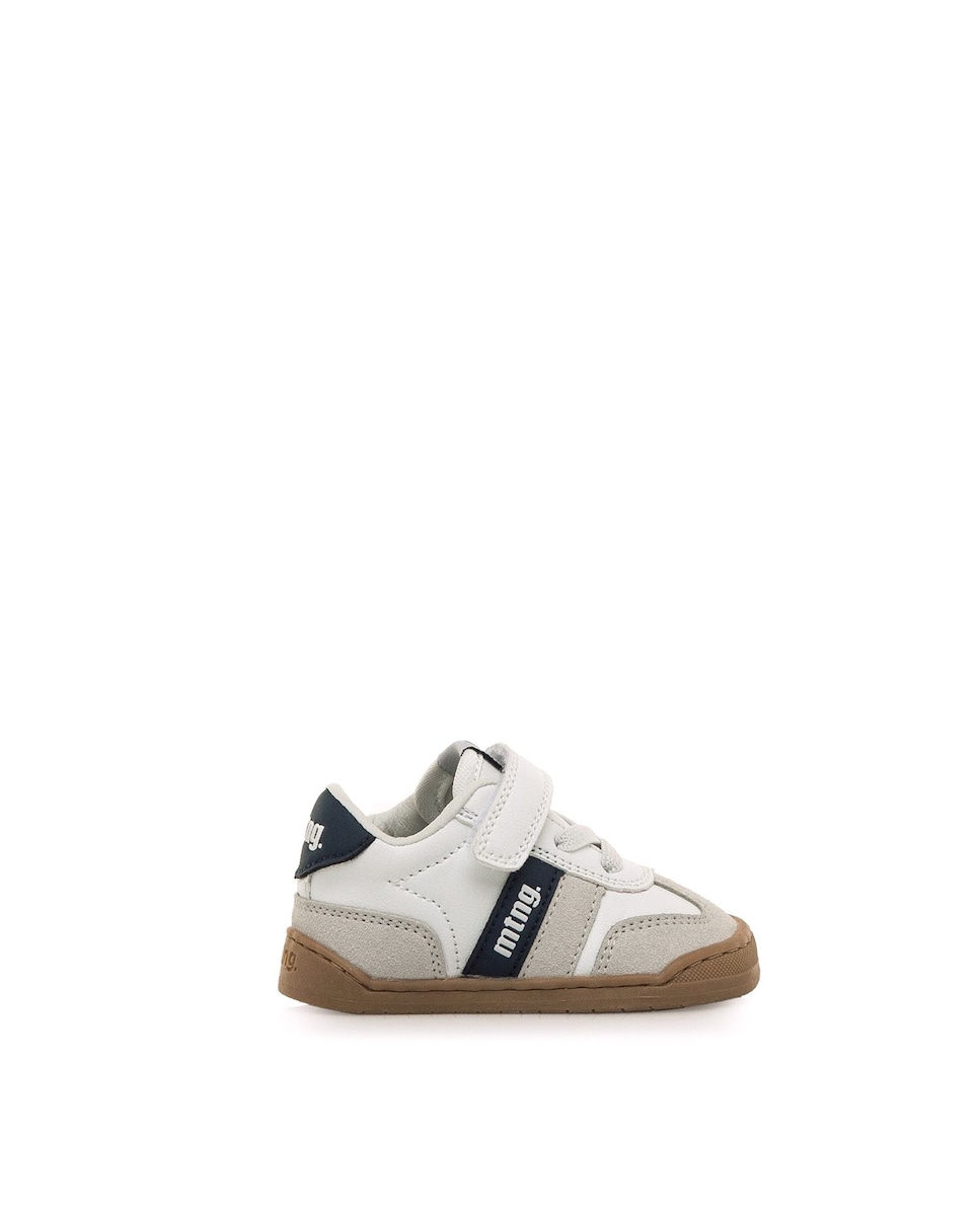 Sapatilhas desportivas de cor branca para bebé da marca Mtng, modelo Free Baby, com detalhes em marinho e estilo casual inspirado nas sneakers clássicas. Combinam painéis lisos e textura tipo camurça em cinza, e contam com fecho aderente junto a atacadores elásticos que melhoram o ajuste e o conforto. A sola em caramelo contrasta com o corte superior e aporta um toque atual ao design. Com certificado VEGANO selado pelo INESCOP, o qual garante que a natureza química principal do material não se corresponde com fibras de origem animal. Desenhadas e desenvolvidas especialmente em colaboração com o Dr. Juanjo López, traumatologista desportivo e infantil, para respeitar o desenvolvimento natural do pé das crianças. Graças à sua biqueira larga permite o livre movimento dos dedos dentro do sapato. A sua sola tem 3 mm de espessura e com zero drop (totalmente plana) respeita o natural desenvolvimento do pé do pequeno e seus elementos flexíveis e torsionáveis faz com que o pé do não esteja encorsetado pela estrutura do sapato. As palmilhas removíveis facilitam verificar se o tamanho do calçado é o correto para o seu filho. Além disso, a sua fácil abertura facilita que o possa descalçar e calçar de forma autónoma. Acompanha os primeiros passos do seu bebé com mtng.