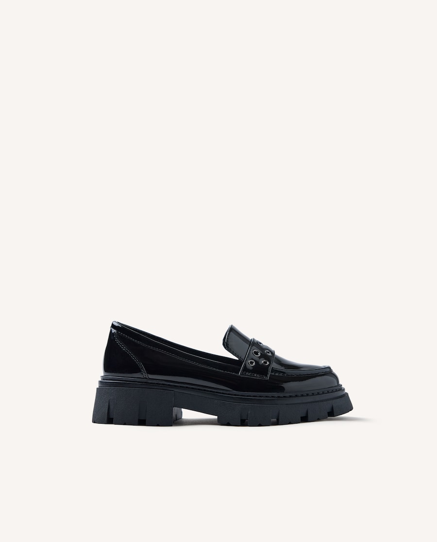 Mocassins encerados com detalhe de máscara e ilhós. Contam com palmilha acolchoada. Corte e forro de poliuretano. Palmilha de pele. Sola de TPR flexível.
