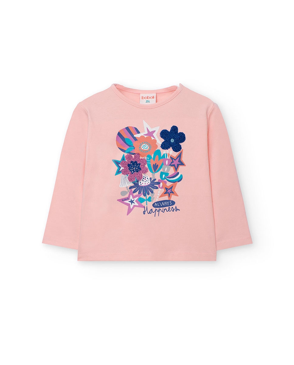 T-shirt de malha em tom rosa com um encantador estampado de flores, desenhada para adicionar um toque doce ao guarda-roupa infantil. Ideal para a temporada de outono e inverno, seu tecido proporciona calor e flexibilidade. Gola redonda e mangas compridas oferecem conforto adicional nos dias mais frescos. Disponível em tamanhos desde 12 meses até 10 anos, esta t-shirt é fácil de combinar com calças ou saias, criando looks versáteis e alegres.