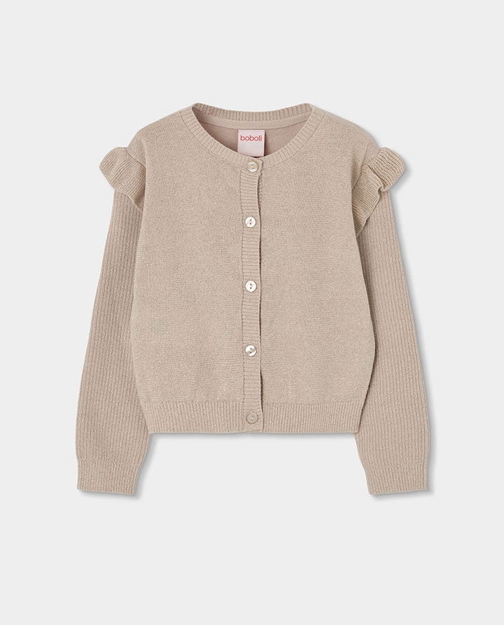 Casaco de malha para menina ideal para as estações de outono e inverno. Confecionado em um tecido suave, oferece conforto e calor. O design em bege torna-o versátil e fácil de combinar com outras peças. Apresenta uma gola redonda e botões na parte frontal, o que facilita o seu uso. Os detalhes de folhos nos ombros adicionam um toque de elegância. Está disponível em tamanhos desde 2 até 14 anos. É perfeita para adicionar um toque chic a qualquer conjunto do dia a dia.