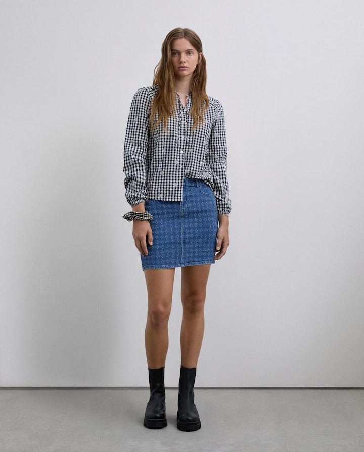 Saia mini confecionada em algodão com um pequeno percentual de elastano. Design em denim com estampado desgastado. Cinco bolsos de estilo clássico e fecho frontal com botão e fecho de correr.