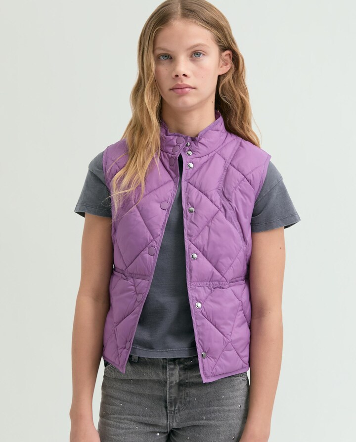 Colete acolchoado confecionado em nylon reciclado. Bolsos laterais. Fecho frontal com botões. Detalhe etiqueta com logo nas costas. Regular Fit.