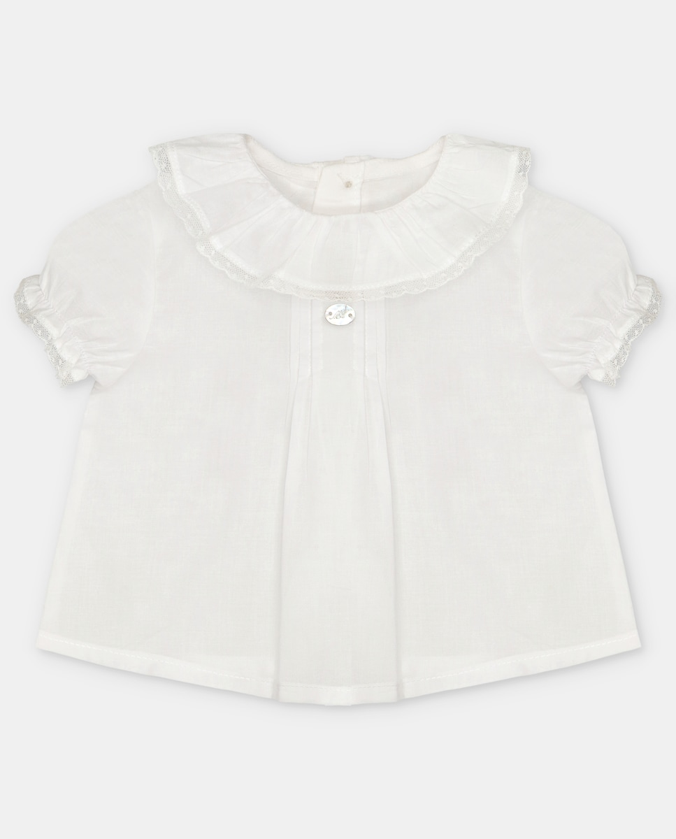 Camisa de bebé menina de voile com gola de volante, detalhes de renda valencié e pregas. Realizada em 100% algodão. Fabricada em Espanha.