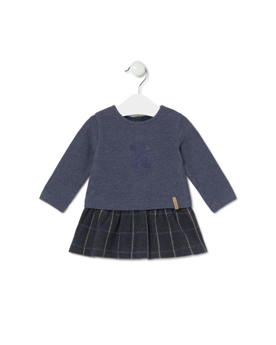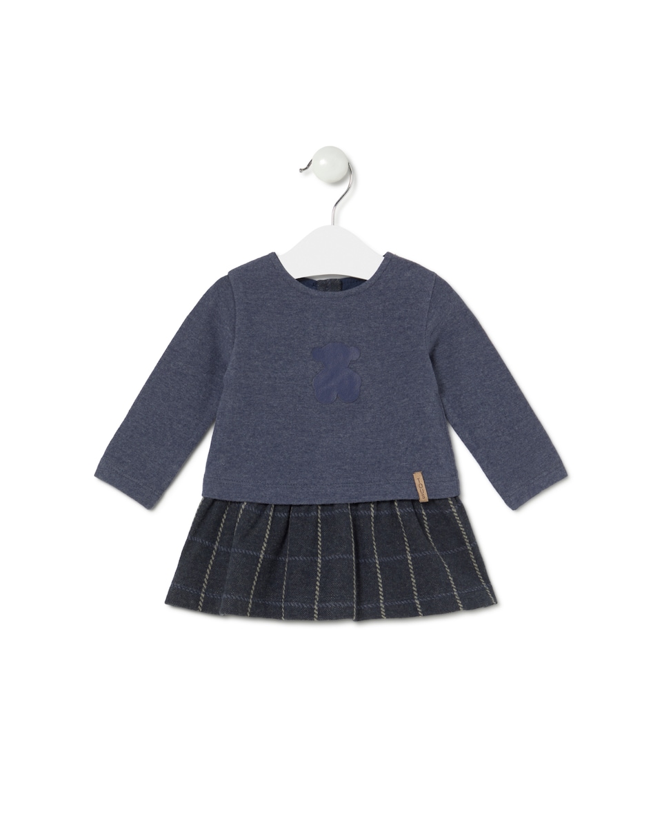 Vestido Tous Baby de gola redonda em manga comprida. Confecionado em suave tecido liso de malha no corpo, combinado em quadrados na parte da saia de corte evasé, cintura baixa. Urso aplicado na parte frontal.