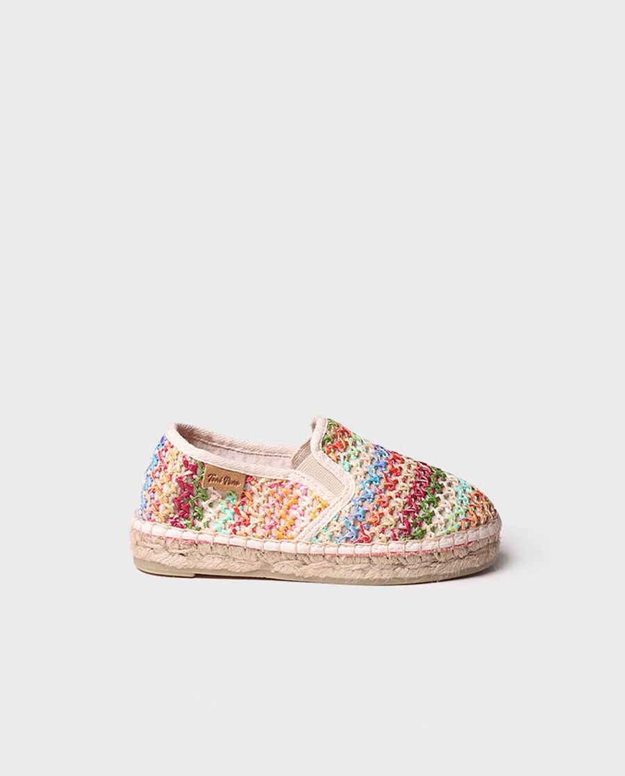 EFES-NZ. Estas alpercatas multicolor para crianças estão confecionadas em ráfia. A sola tem uma altura de 2 cm e a base da sola é de borracha antiderrapante. A planta interior está forrada em tecido e conta com uns elásticos laterais que ajudam ao calce do pé. A união do tecido e da sola está cosida à mão com um fio de algodão. É um modelo 100% vegano.Estas alpercatas calçam o tamanho habitual, se estiver entre dois tamanhos recomendamos escolher o maior.
