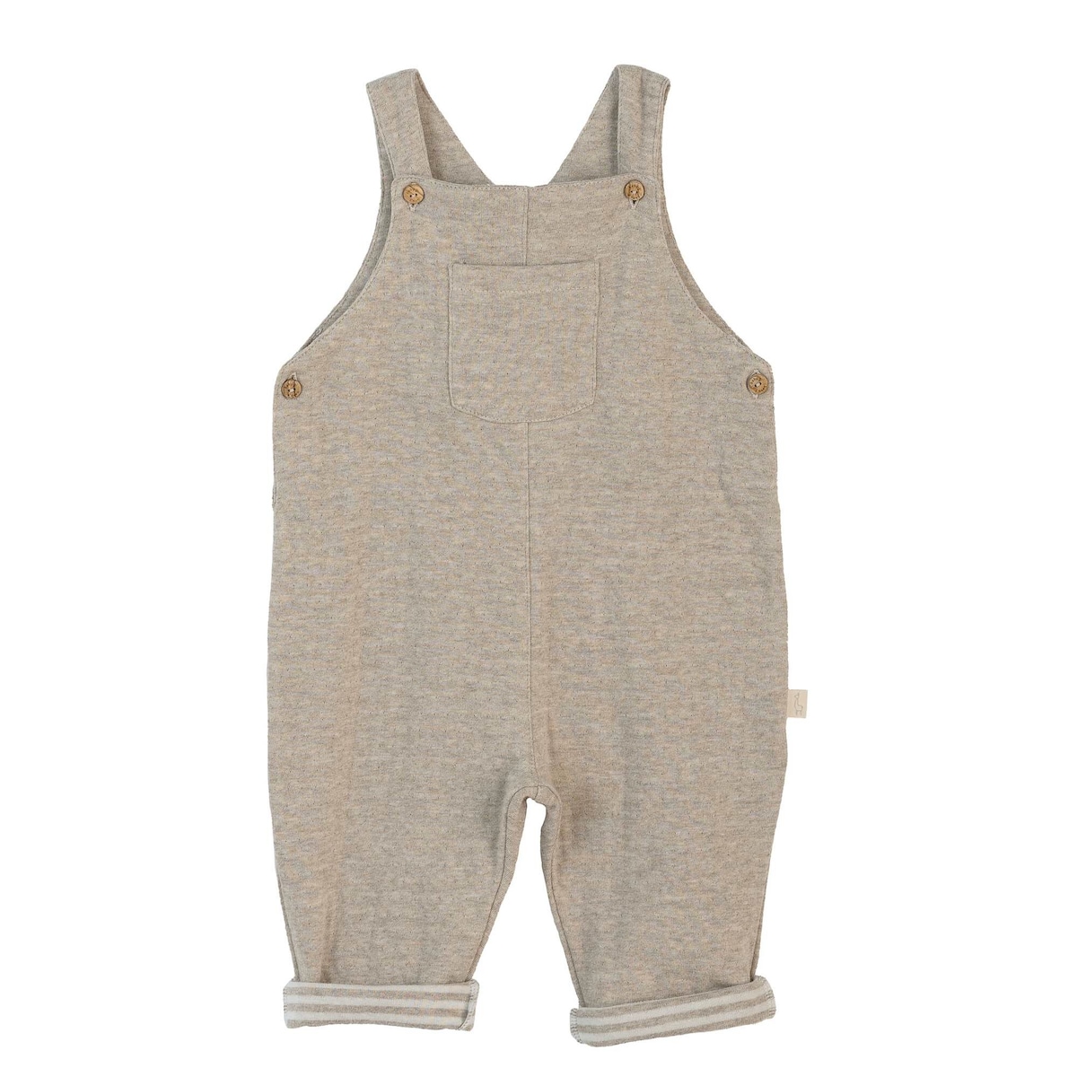 Jardineira em jersey malha dupla. Alças ajustáveis com botões de madeira. Com bolso pespontado. Fabricado em Portugal.