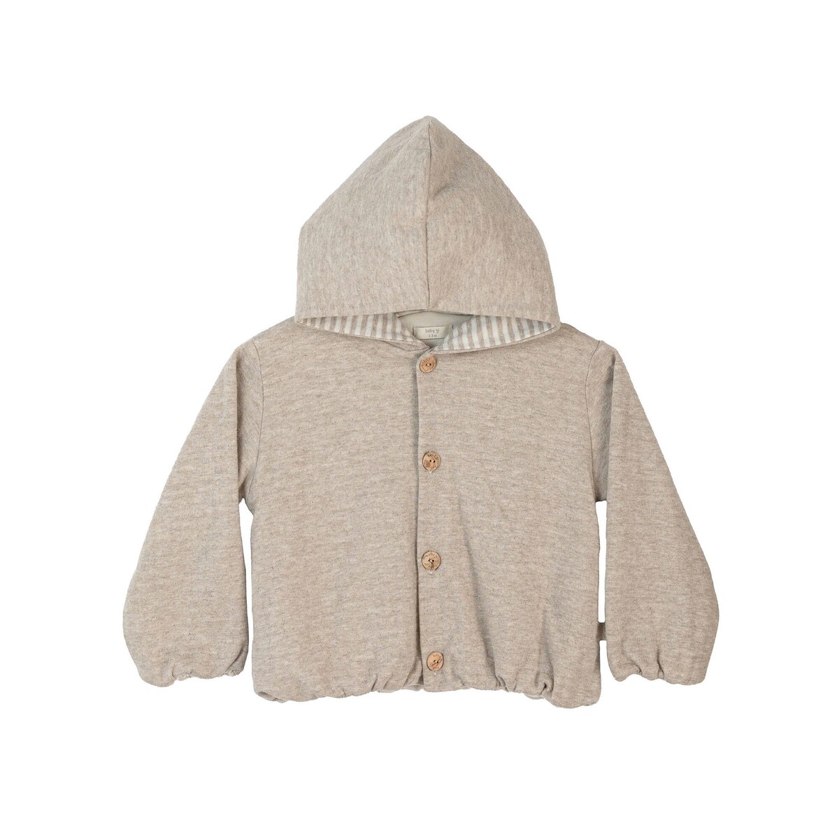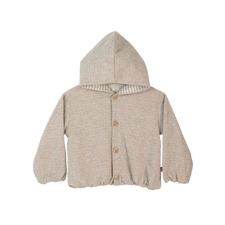 Casaco em jersey malha dupla com capuz. Com elástico nas mangas e parte inferior. Botões de madeira. Fabricado em Portugal.