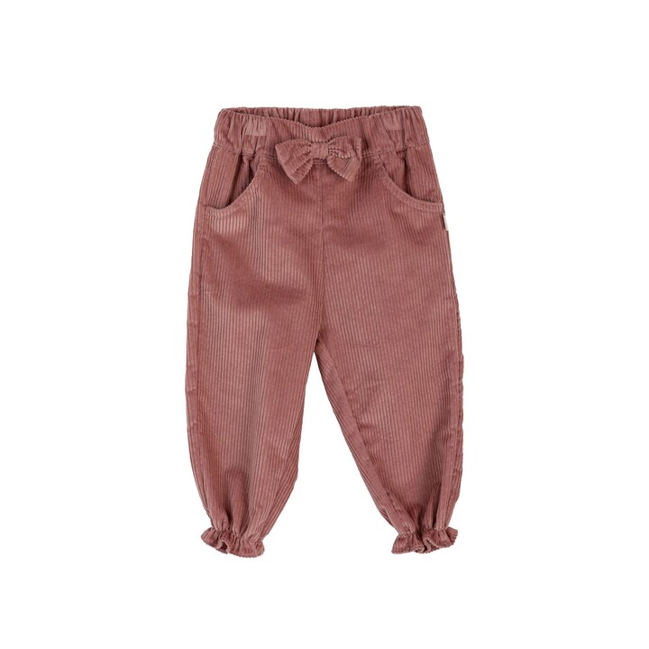 Calças em bombazine 100% algodão com bolsos e laço na frente. Com elástico nos tornozelos. Fabricado em Portugal.