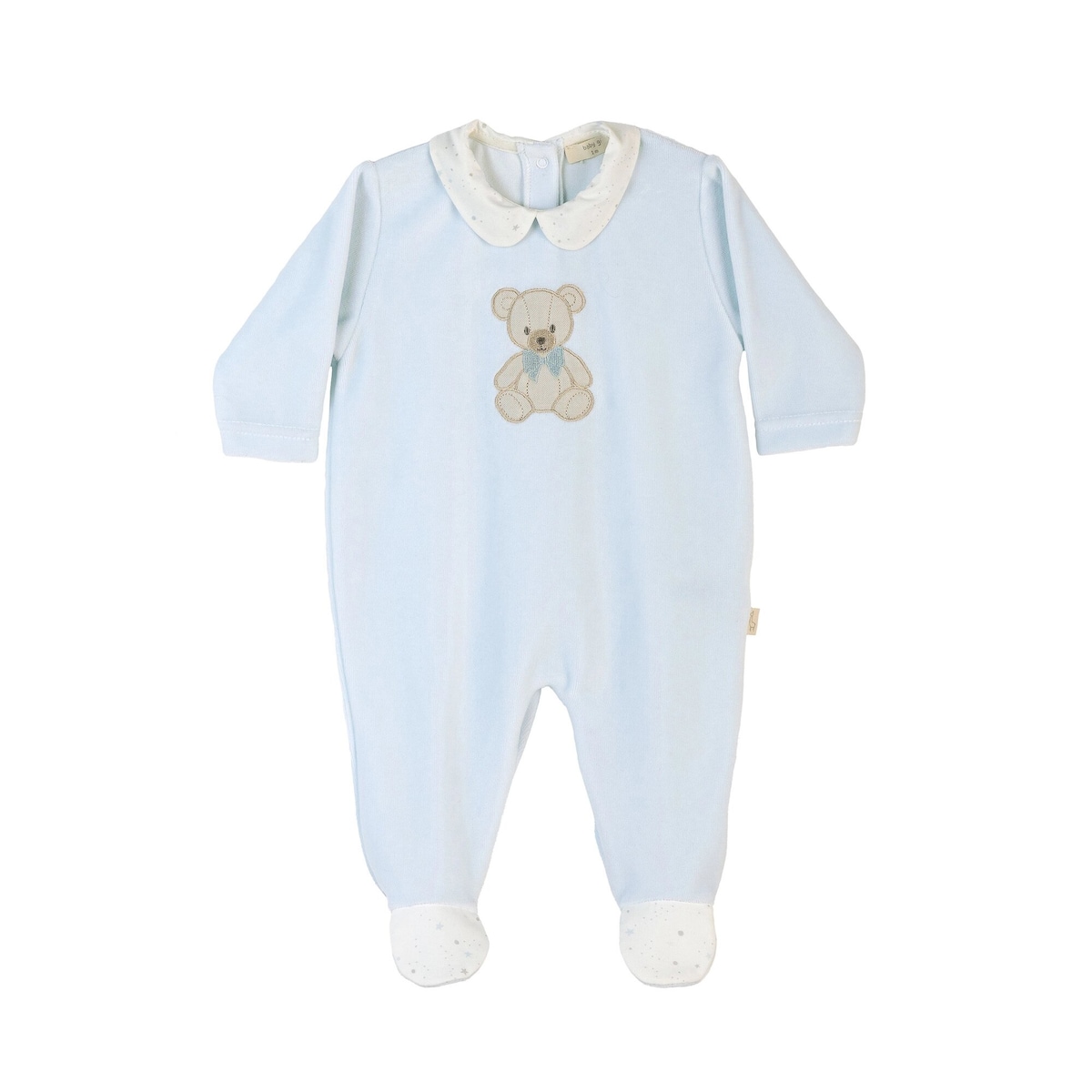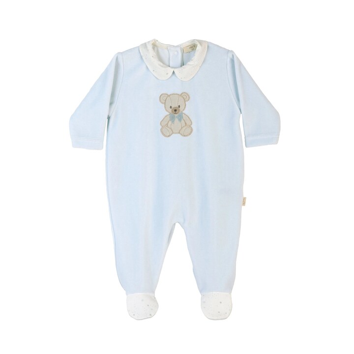 Babygrow em veludo com gola redonda e urso bordado. Fabricado em Portugal.