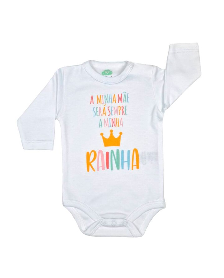 Body de manga comprida em algodão com abertura no ombro "A MINHA MÃE SERÁ SEMPRE A MINHA RAINHA". Fabricado em Portugal.