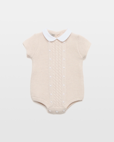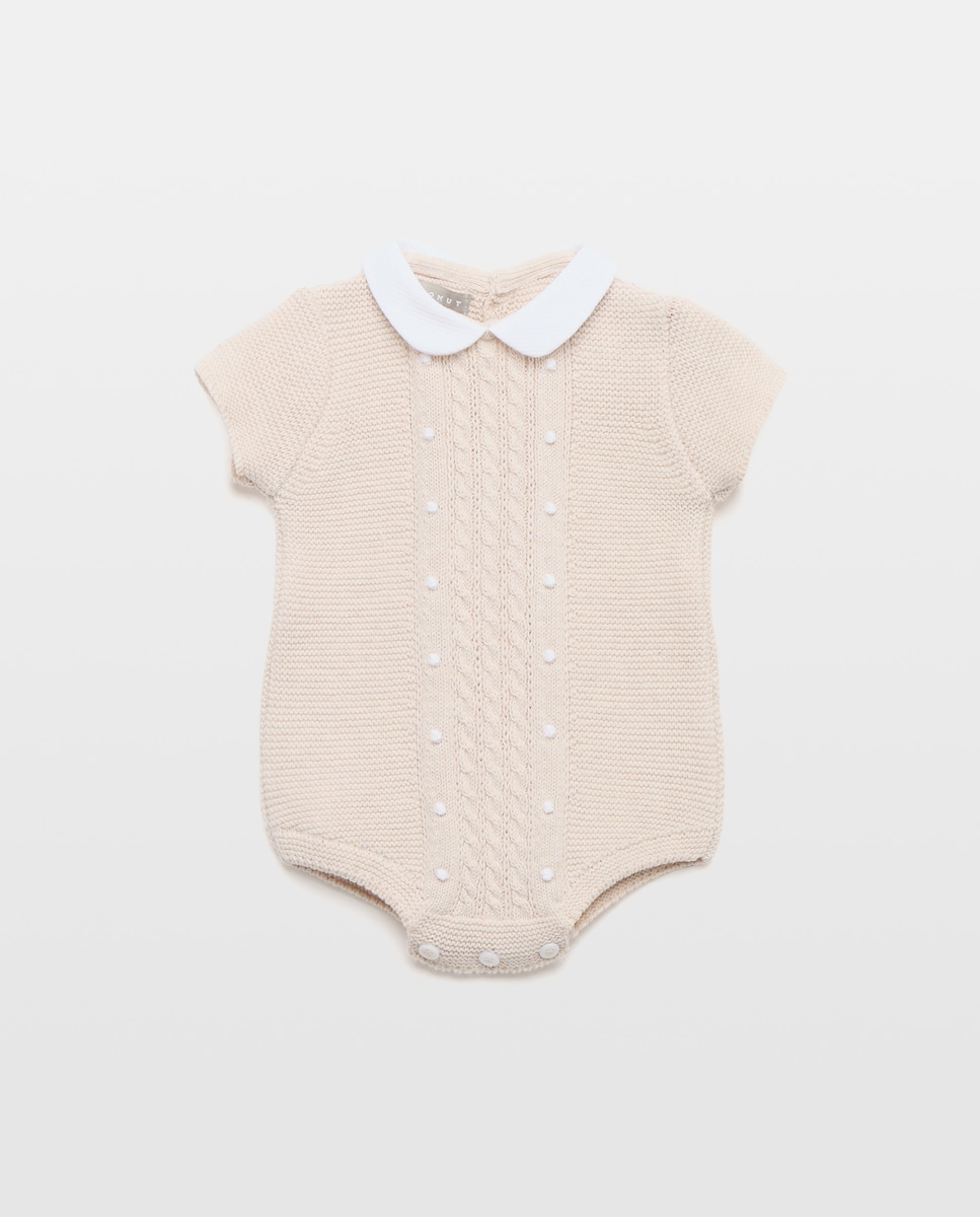 Babygrow com Gola e Manga Curta de Tricot Fantasia com Malha de Cabo Central