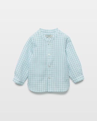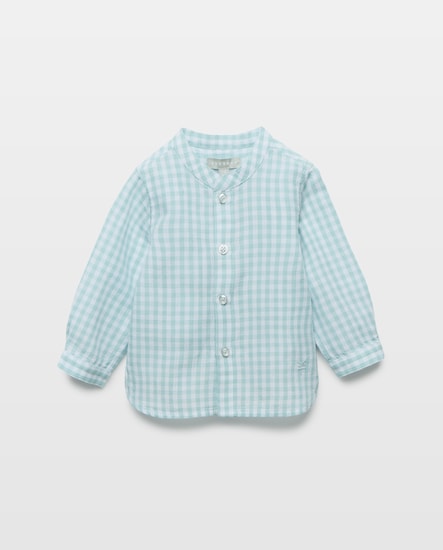 Camisa de Linho de Bebé com Vichy, Gola à Padre e Manga Comprida