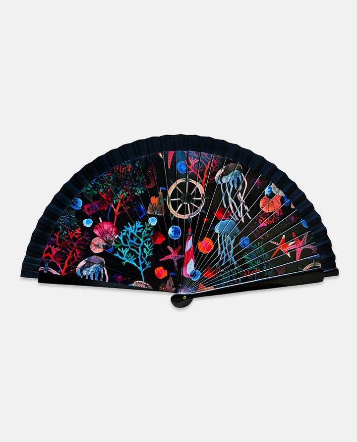 Leque de madeira preto com estampado do mar