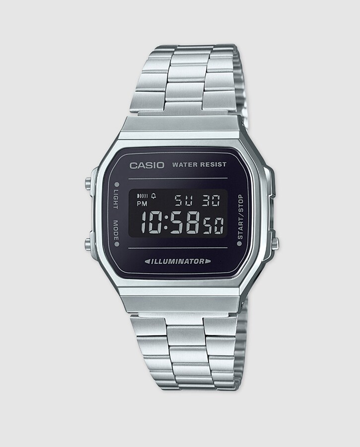 Relógio digital com caixa de resina, cronómetro 1/100 seg. - 1 hora, mostrador preto com indicação da hora padrão de 12/24 horas. Bracelete em aço inoxidável com fecho de ajuste automático.