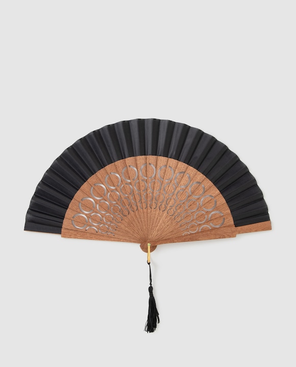 Leque de madeira Garcia com rendilhado geométrico e paisagem preta