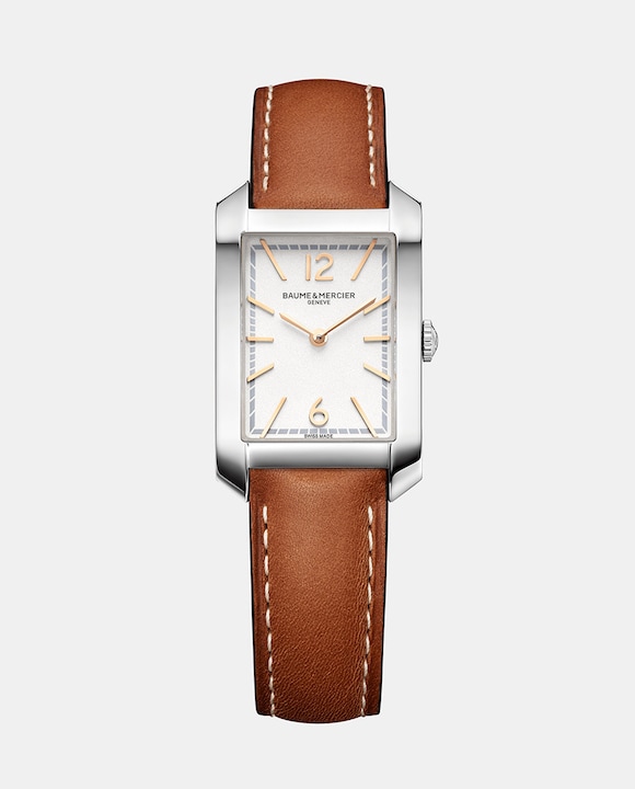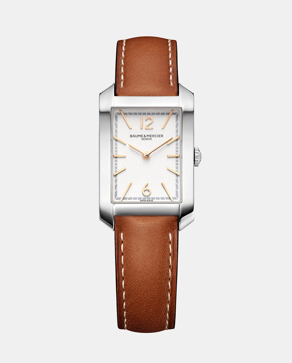 Um relógio de pulso retangular clássico para senhora, este modelo Hampton apresenta um mostrador prateado com elegantes ponteiros em forma de espada e algarismos árabes dourados às 6 e 12 horas.