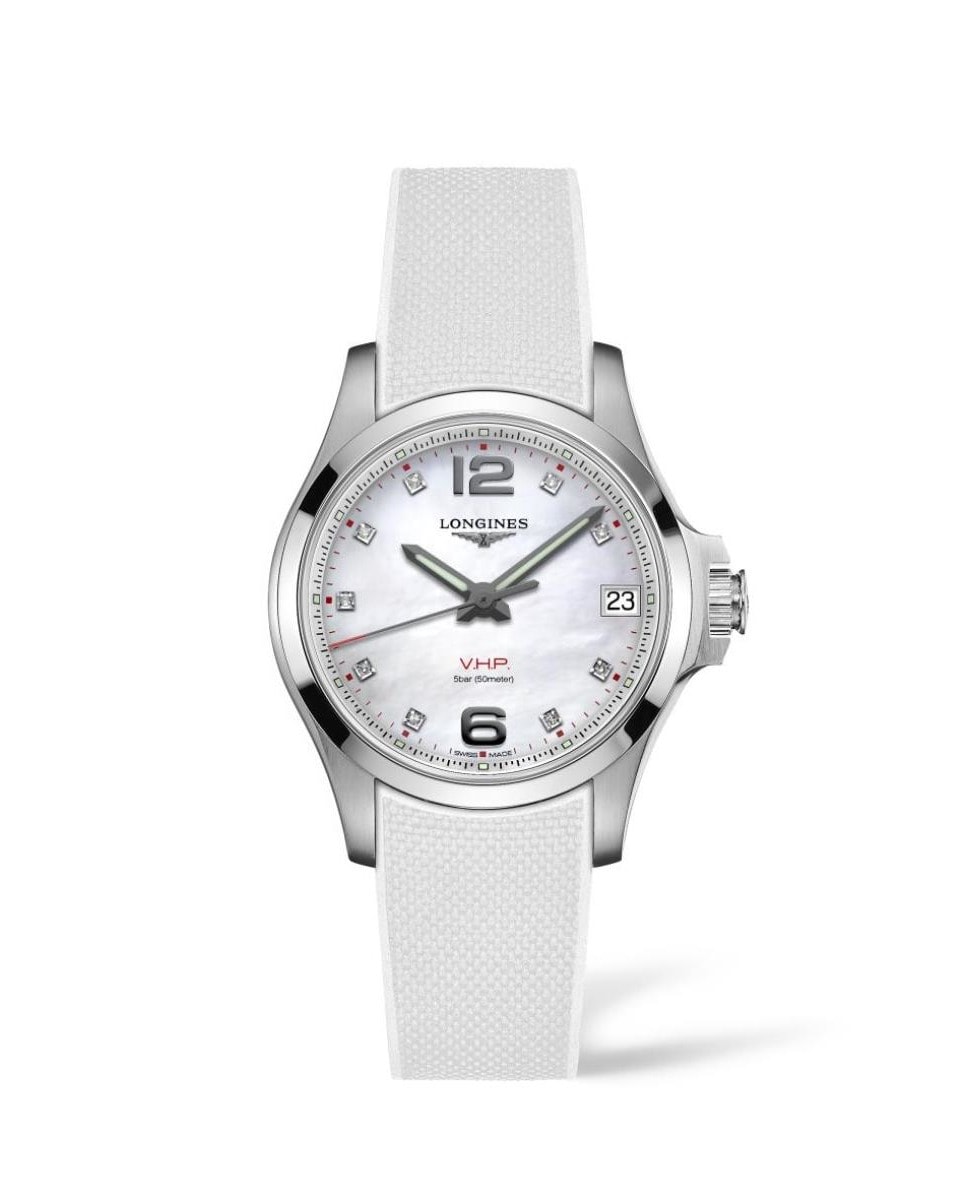 O Longines Conquest V.H.P. combina ultra precisão e alta tecnologia, com um mostrador branco perolado adornado com marcadores de horas em diamante e vidro de safira resistente a riscos, movimento de quartzo e ponteiros e marcadores de horas Super-LumiNova.