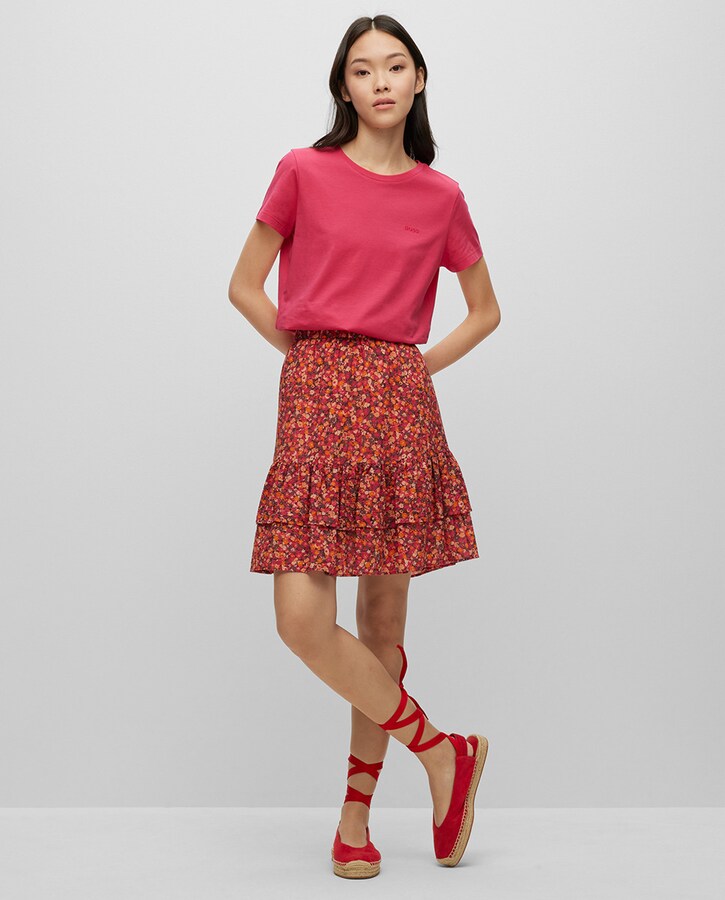 Saia com Folhos e Estampado Floral em Seda, Algodão e Elástico
