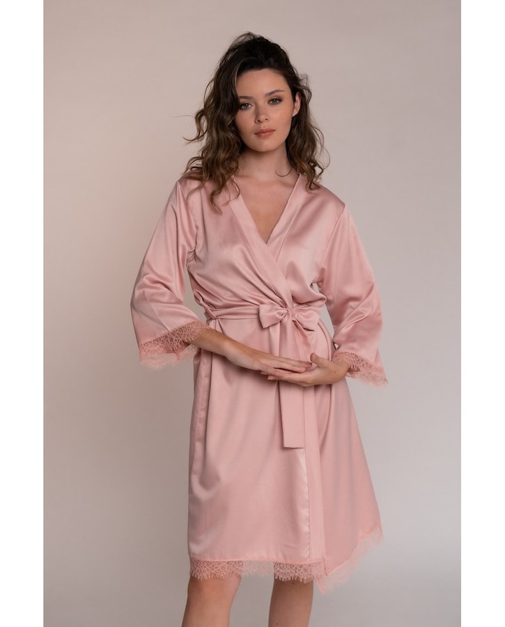 Robe em cetim rosa blush com manga a 3/4 e cinto. Contém renda nas mangas e no fundo.