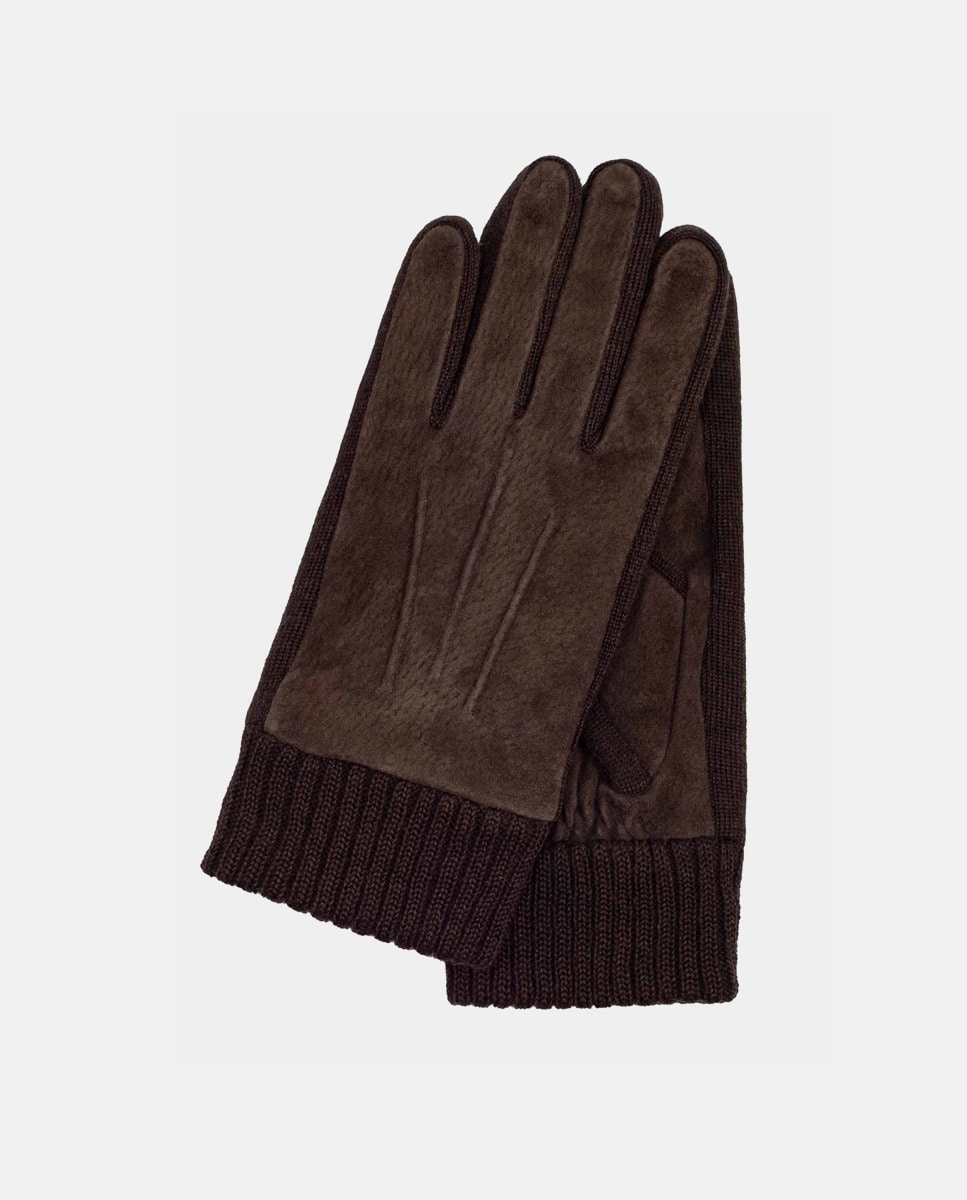 Luvas com Punho de Malha e em Couro - Castanho