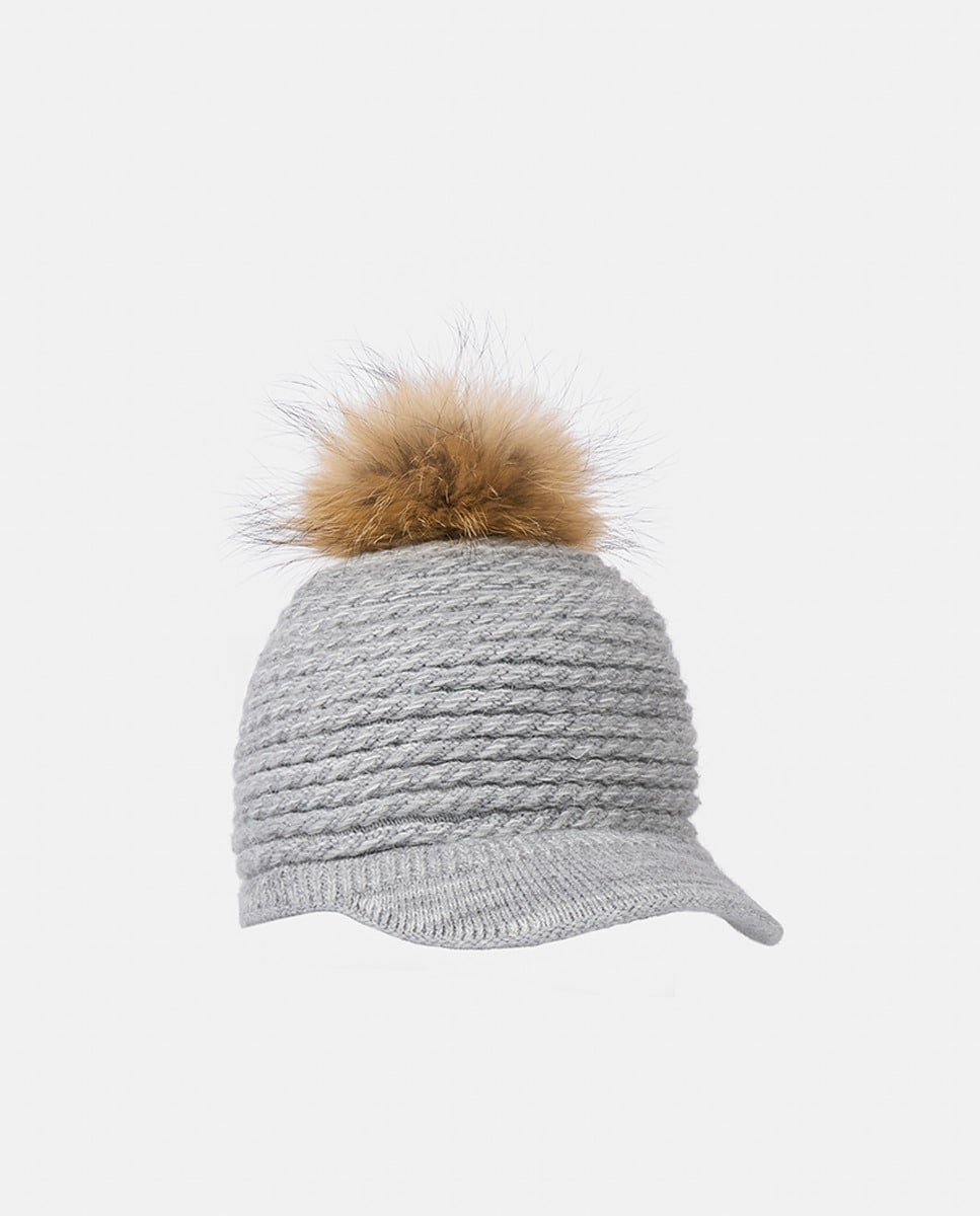Boné de Malha com Pregas e Pompom de Pelo Natural - Cinzento