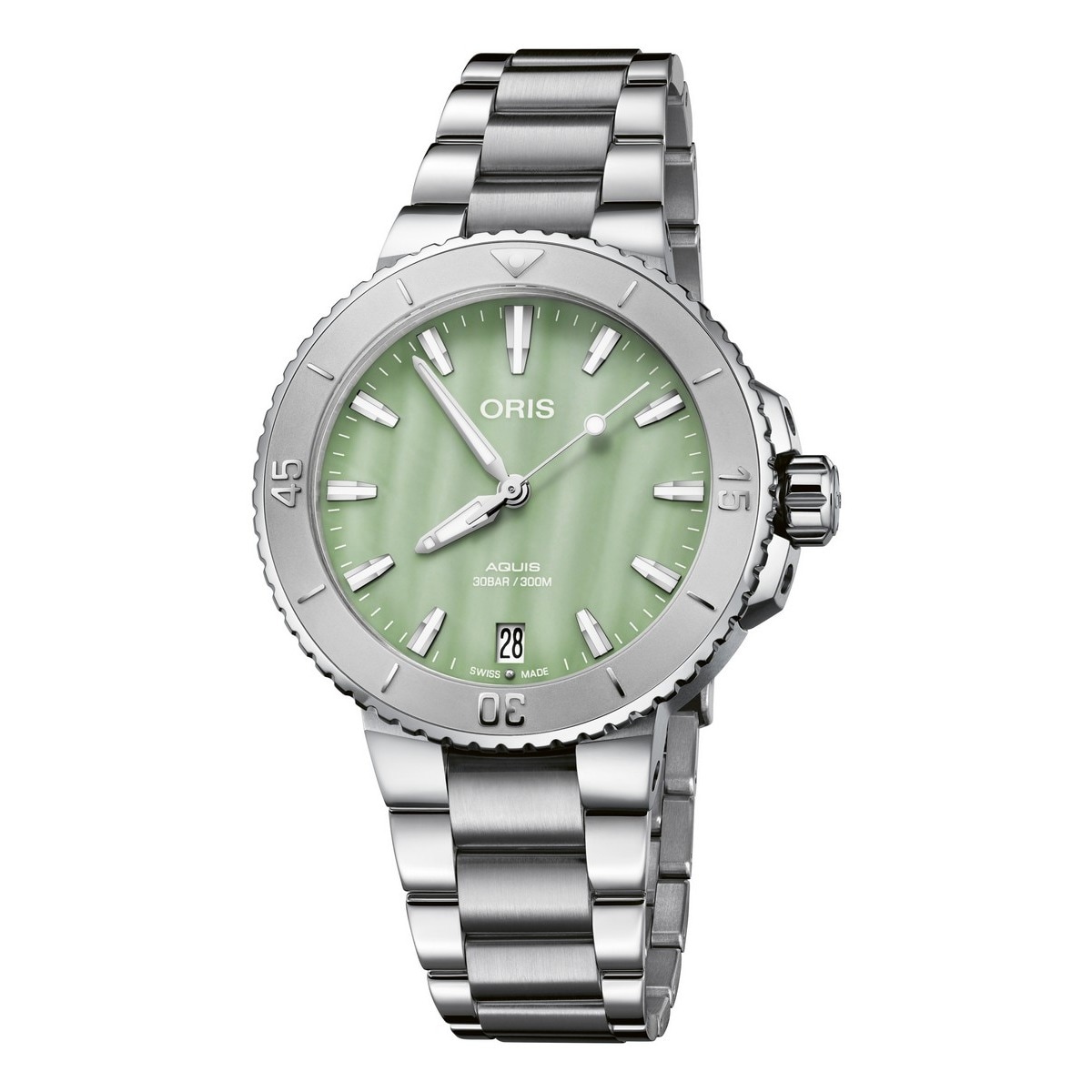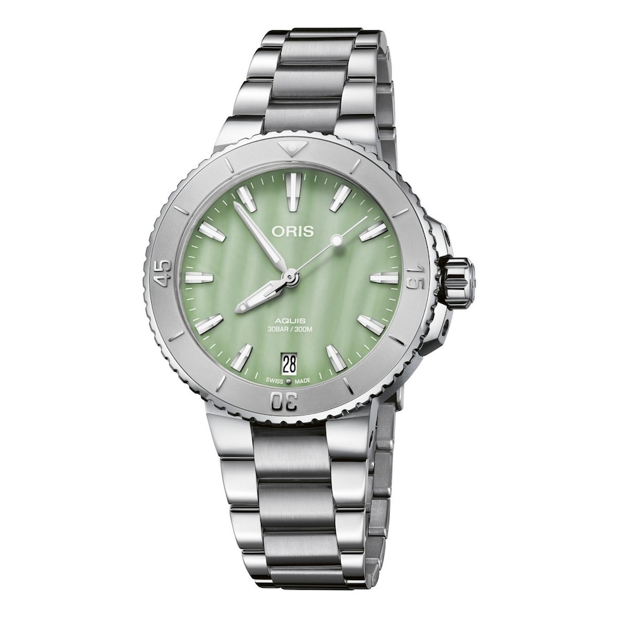 "A silhueta familiar e afunilada do relógio de mergulho Aquis Date forma a base de cada um dos três exemplares desta coleção, mas serão lembrados, principalmente, pelos mostradores de alto contraste em Blush Pink, Aegean Blue e Seafoam Green.