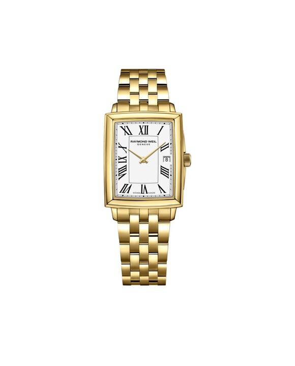 Inspirados pelo movimento Art-Deco, os novos relógios toccata de inspiração vintage abrangem linhas retas, mostradores sumptuosos e são perfeitamente adequados a qualquer ocasião. Alojado numa caixa retangular, exibe um mostrador branco, com horas, minutos e data. Bracelete em aço com tratamento PVD em ouro amarelo.